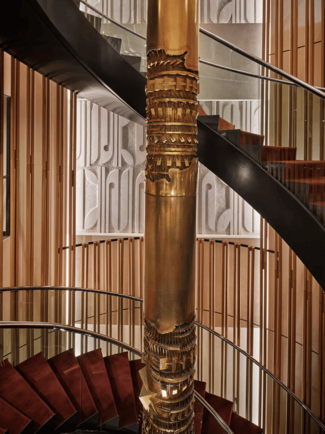 Why it matters: Circulation space is often wasted space, but not at The Jay. A pillar of pure bronze—resplendent in its own right—stands at the center of the spiral and connects all three floors. Hospitality design firm AvroKO leaned into the building’s heavy concrete bones but softened the experience with warm woods, layered textures and a distinctly residential calm. The result is a design language they call “Warm Brutalism”—equal parts structure and soul. (AvroKO)