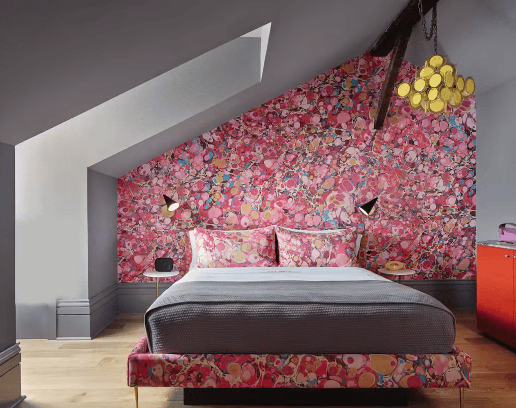 New Orleans’ Hotel Saint Vincent takes its cues from the raucous city around it, then dials everything up a notch. The hotel's most buzzed-about detail—a psychedelic, marbled Voutsa wallpaper—wasn’t found in a modern catalog; it was found in a 160-year-old accounting book. Designers Liz Lambert and Larry McGuire blew up the traditional Florentine marble patterns from the orphanage’s original financial ledgers to create a signature motif that now appears on everything from guestroom headboards to silk Far West robes.